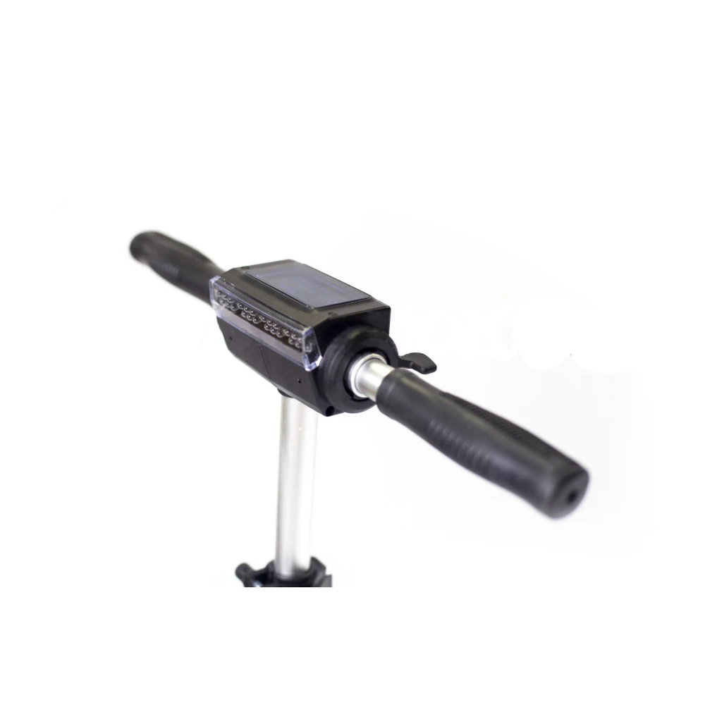 Электросамокат оснащен двумя фонарями спереди и сзади, а также бортовым компьютером с ярким экраном, который отображает всю важную информацию. Высота руля на самокате регулируется, что обеспечивает уменьшение габаритов. С электросамокатом удобно передвигаться как в транспорте общественного движения. так и на такси и на собственном авто.