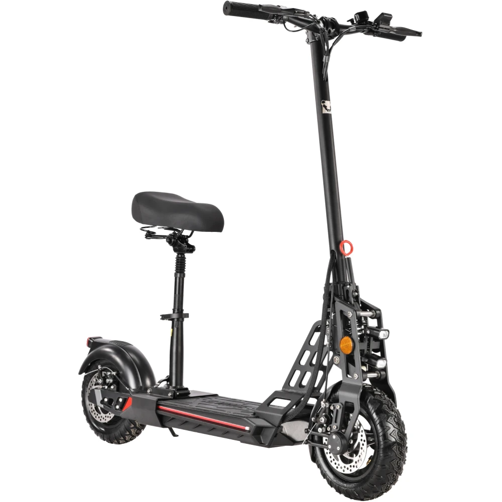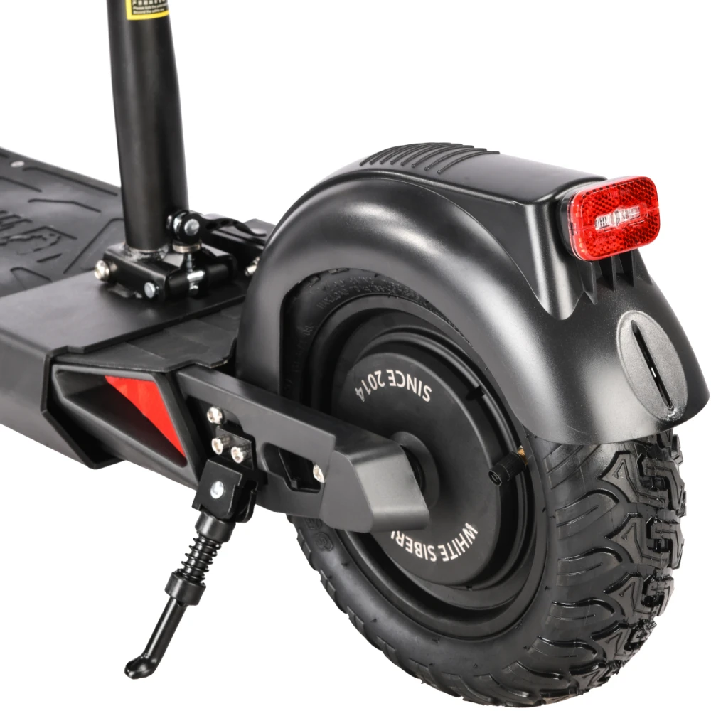 Техника оснащена удобным сиденьем, повторяющем анатомические части тела. При мощности мотора 1000 Вт максимально допустимая производителем скорость составляет 55 км/час. Запас хода электросамоката составляет 55 км. Время зарядки батареи – 8 часов.