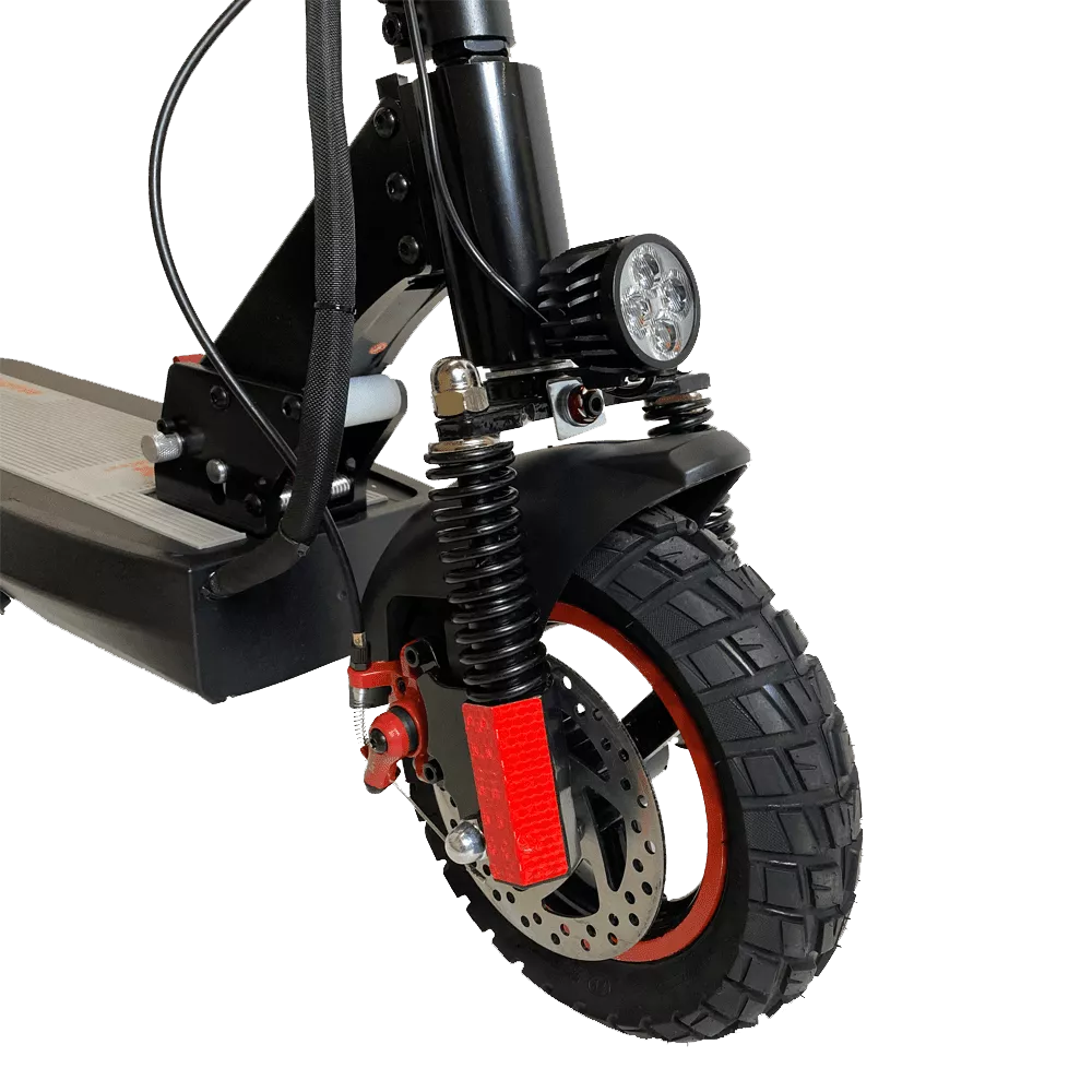 Отличные ходовые характеристики сделали эту модель популярной. Агрегат не боится бездорожья, мощный двигатель 500 Вт и хорошая амортизация делает движение по гравийной и грунтовой дороге достаточно комфортным. Два пружинных амортизатора на переднем и два на заднем колесе делают ход самоката мягким. Для удобного передвижения на большие расстояния предусмотрено съемное сидение. Руль и сидение регулируется по высоте. Колеса с накачиваемыми шинами имеют диаметр 10 дюймов. На переднем и заднем колесах установлена дисковая тормозная система.