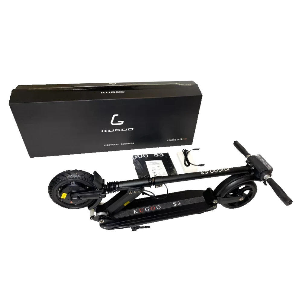 Самокат Kugoo S3 имеет запатентованную складную конструкцию, в сложенном состоянии его легко транспортировать. Его вес 11 кг позволяет переносить агрегат в руках и брать в общественный транспорт. Есть бортовой компьютер, светодиодная фара.