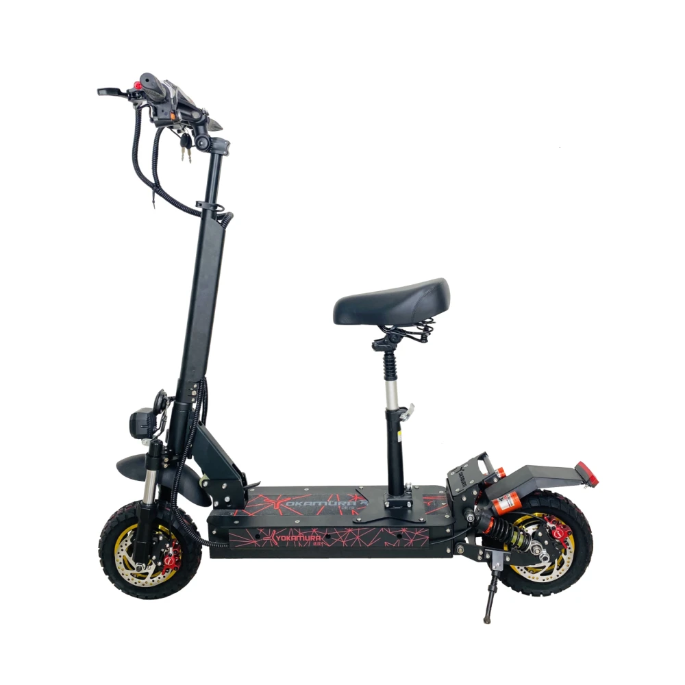 YOKAMURA RX2 оборудован колесами 10.5 дюймов, на каждом колесе протекторные покрышки, с глубоким рельефом. На переднем и заднем колесе установлены по два пружинных амортизатора, это делает ход мягким даже на бездорожье. В комплекте предусмотрено съемное сидение, во время длительных поездок вам будет комфортно, при желании можно его снять.
