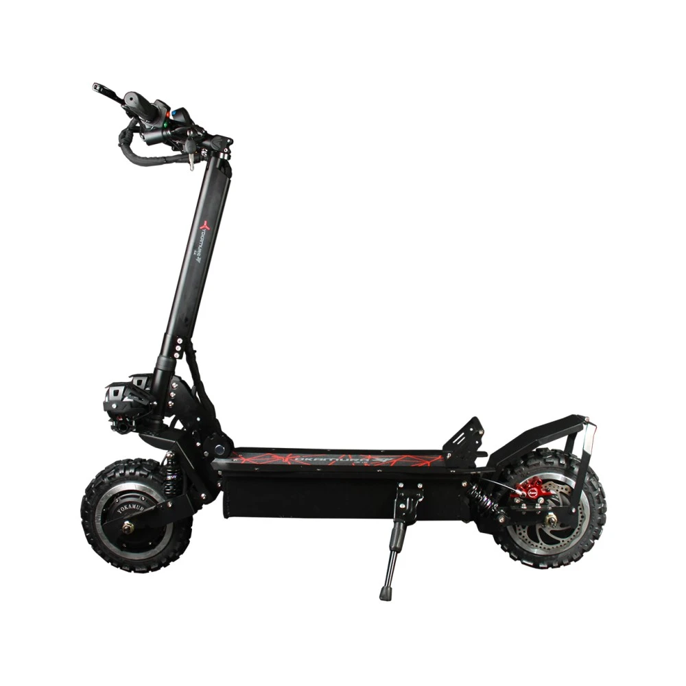 Электросамокат YOKAMURA SX создан японской компанией. Производитель в своем стиле оснастил его двумя двигателями, полный привод дает приличную мощность агрегату. Два мотор-колеса вместе имеют 3200 Вт. Есть возможность отключить один привод, на руле есть кнопка переключения режимов. При эко-режиме значительно экономиться заряд аккумулятора. Такой транспорт рассчитан на передвижение по различным дорожным покрытиям, он легко преодолевает дорогу на подъем.