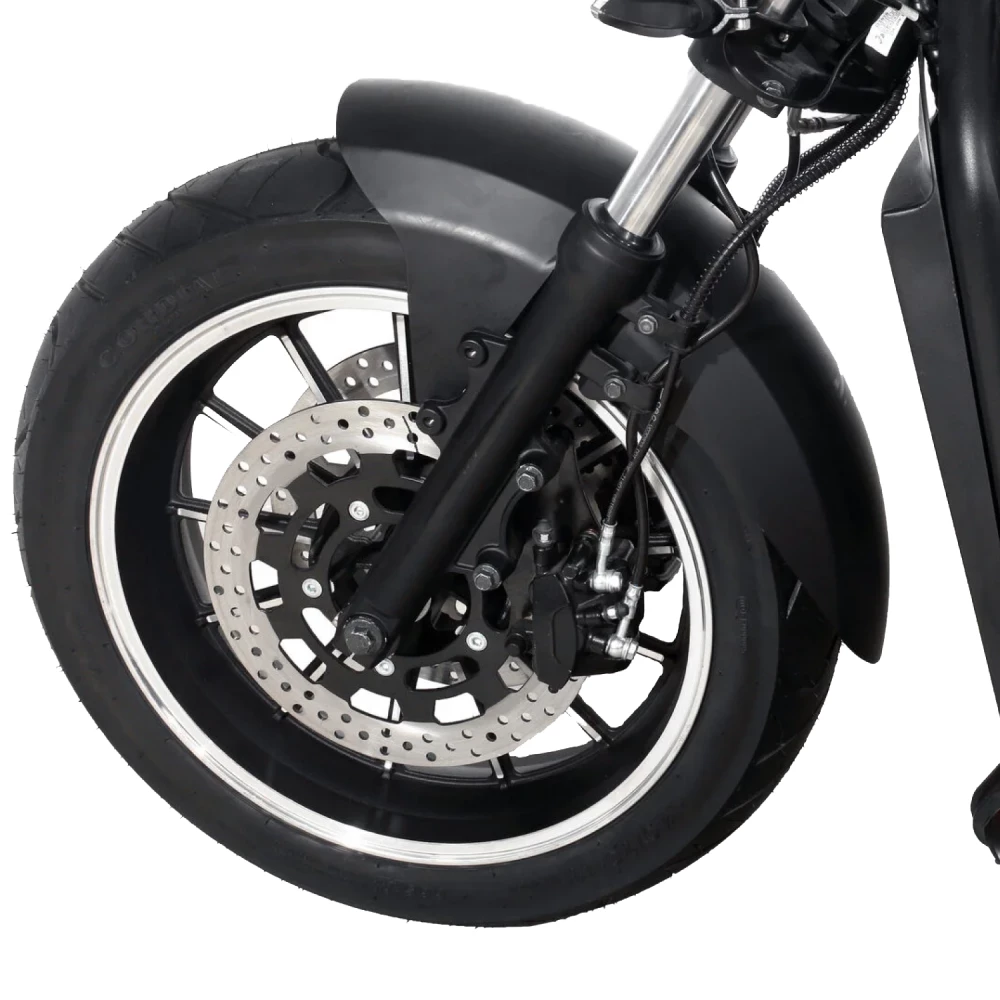 Данный электросутер оснащен широкими колесами и качественной системой амортизации.