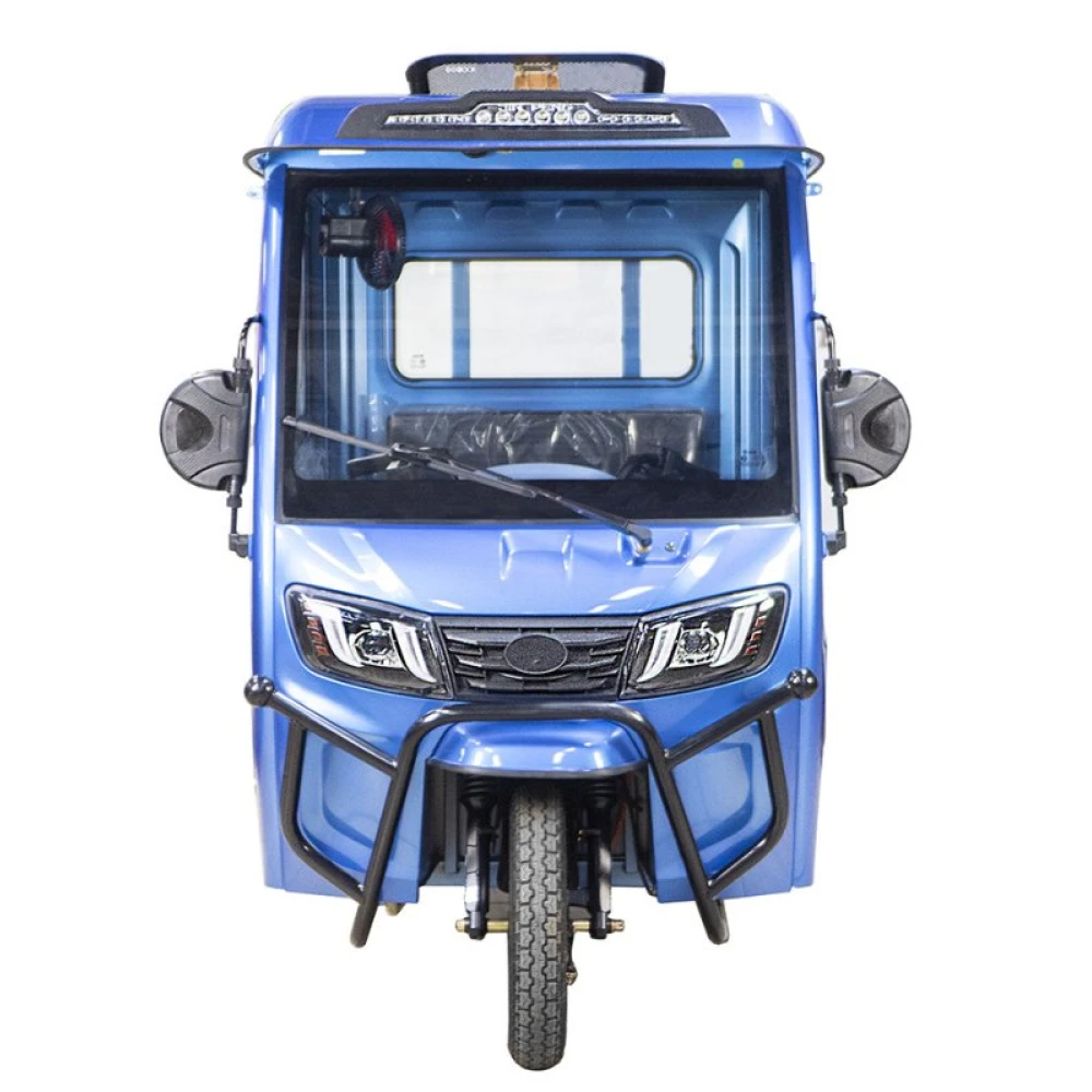 Грузовой электротрицикл Rutrike КАРГО Кабина 1500 60V1000W в темно-синем цвете - это надежное и удобное средство доставки грузов. Он обладает высокой скоростью, большим пробегом и надежным задним тормозом.
