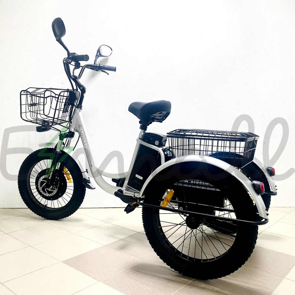 ТРИЦИКЛ ELTRECO PORTER FAT 500 – это трехколесный грузовой велосипед, который имеет мощный электродвигатель в 500W. Он справится с любой трудной задачей. Его можно эксплуатировать на даче, на придомовом участке, при перевозке продуктов или небольших грузов. Он комфортен даже при обычной велопрогулке, в багажнике можно разместить рюкзак/сумку, необходимый инвентарь.