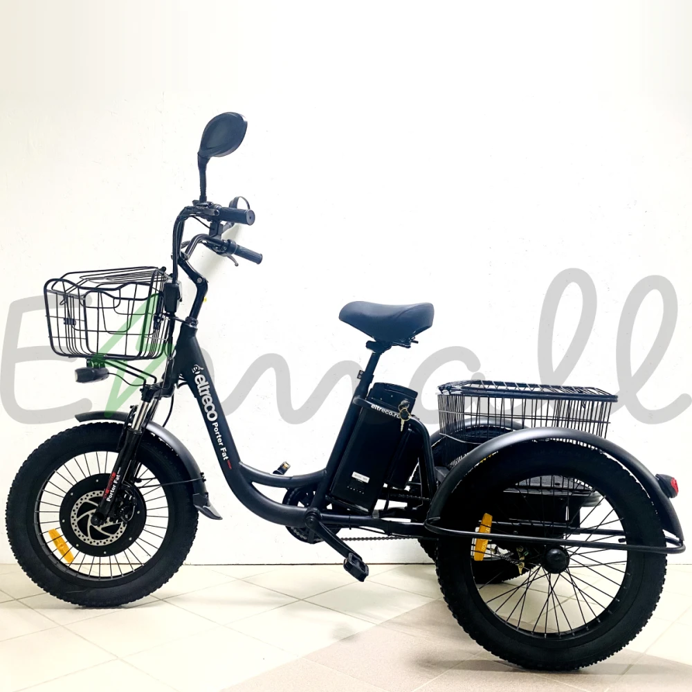 ТРИЦИКЛ ELTRECO PORTER FAT 500 UP! работает от долговечной аккумуляторной батареи. Если она разрядилась, трицикл сможет проехать еще до 40 км на резерве. Имеет стильные светодиодные фары, стальные полноразмерные крылья. Впереди на руле расположена легкая корзина, сзади – большая вместительная.