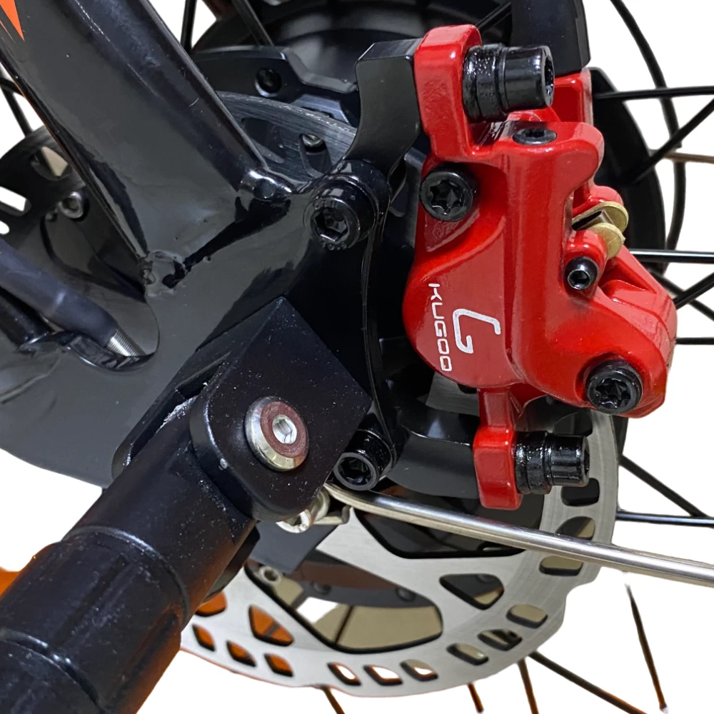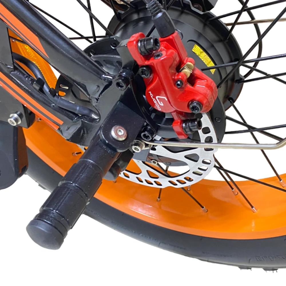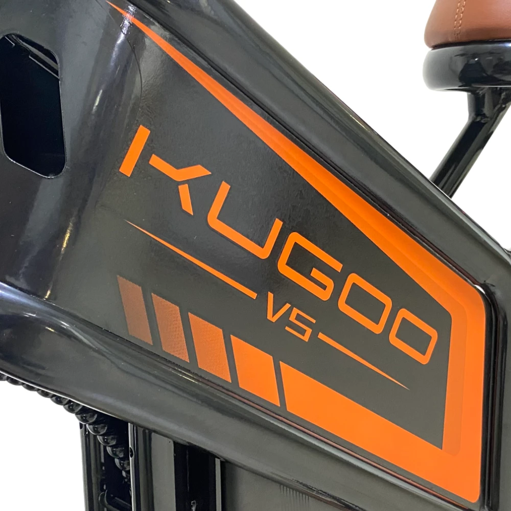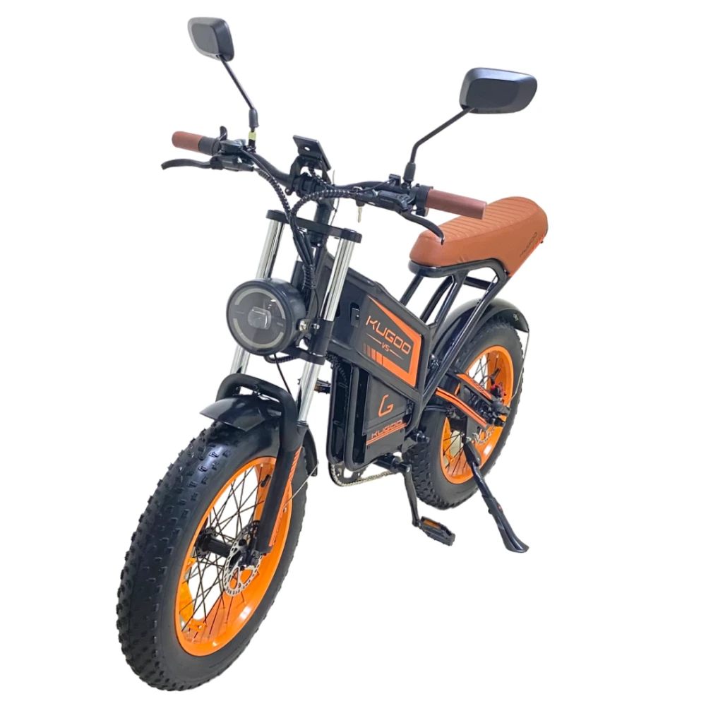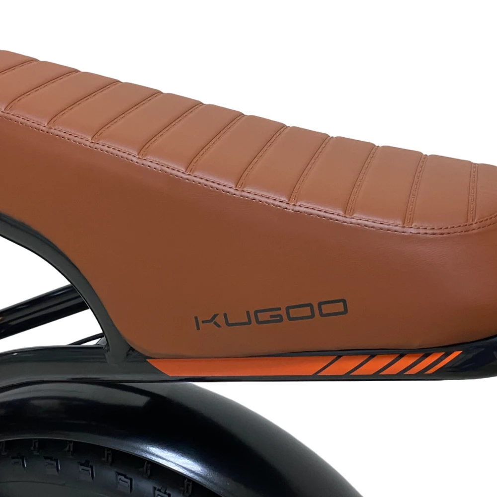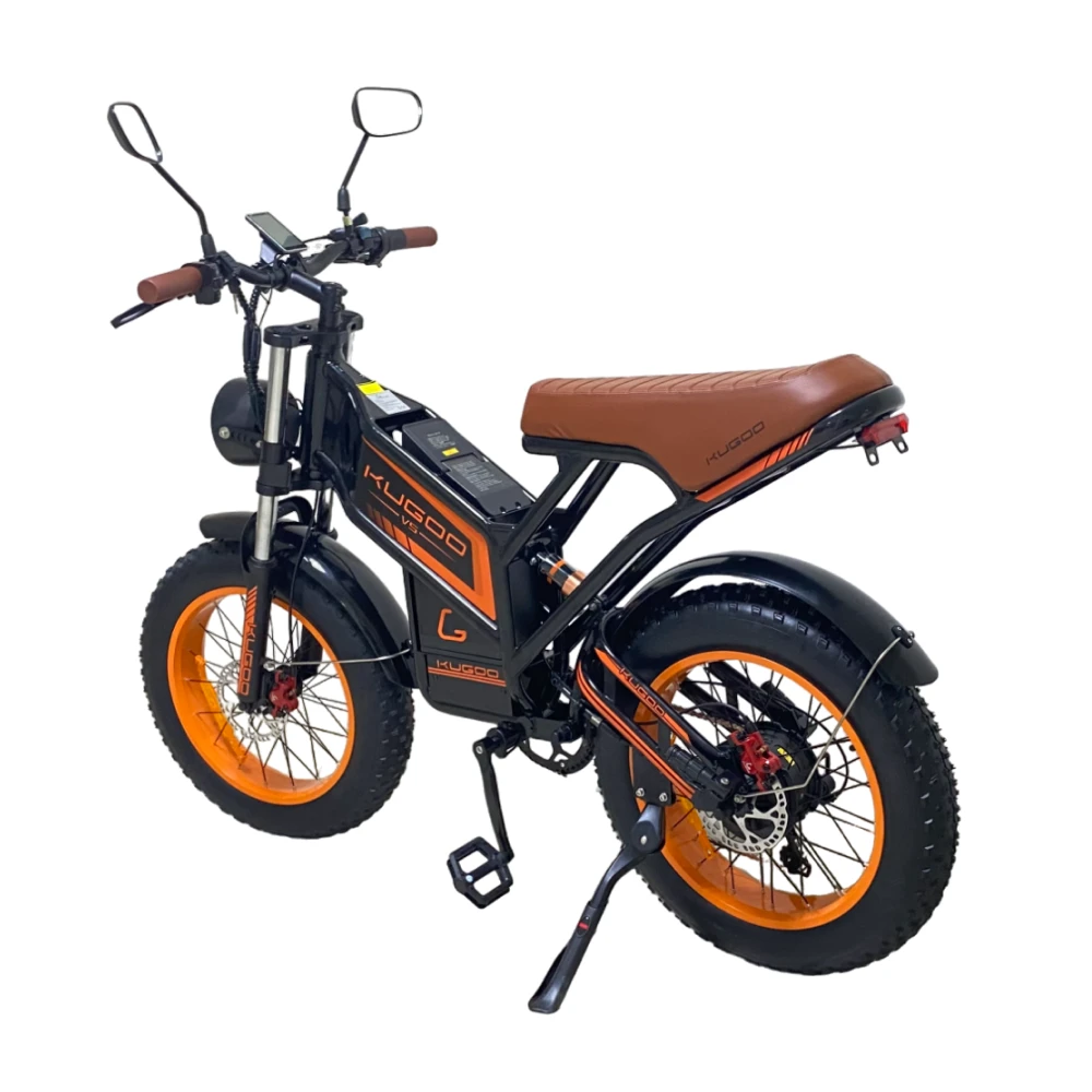 Представляем новинку от компании Kugoo — электровелосипед Kugoo Kirin V5. Этот мощный байк внешне не отличим от мотоцикла: мотоциклетная вилка спереди, амортизатор для заднего колеса, большие и широкие покрышки 20*4.0 дюймов. Впечатляющая большая фара обеспечивает отличное освещение, а складывающиеся подножки для пассажира добавляют удобства. Гидравлическая тормозная система гарантирует надежную остановку, а стильная рама в черном цвете с оранжевыми дисками и надписями, кофейными сиденьем и грипсами делают его уникальным. С задним мотор-колесом на 750W, электровелосипед развивает скорость до 50 км/ч и обладает пробегом до 55 км на одном заряде благодаря мощному аккумулятору 20Ah.