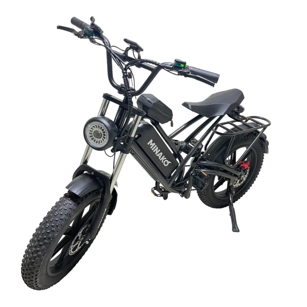 Электровелосипед Minako FOX 15Ah (Литые) в черном цвете – супербайк по лучшей стоимости предлагает купить наш интернет-магазин. Модель относится к категории быстро распродаваемой. Внешне напоминает мопед. Выглядит круто и презентабельно. Предназначен для активных пользователей, не представляющих жизни без экстрима. Прочная надежная рама, фирменная начинка обещает скоростную комфортную езду. Удобное комфортабельное седло исключает нагрузку на позвоночник, появление ощущения усталости. При мощности электромотора 1000 Вт максимальные скоростные параметры составляют 55 км/час. Емкости аккумулятора (15000мАч) достаточно для преодоления дистанции – 30 км). Батарея размещена в защитном блоке, исключающим внешнее повреждение устройства. 20-дюймовые колеса с 4-дюймовыми шинами выглядят агрессивно, накатистые, отлично сцепляемые с разными вилами поверхности. Безопасность эксплуатации гарантирована большой светодиодной фарой, фирменными тормозами и наличием бортового компьютера. Последний предоставляет полезную для райдера информацию: скоростные параметры и степень зарядки батареи. На электровелосипеде безопасно ездить по ровной дороге и пересеченной местности, в непогоду и любе время суток. Для заказа техники предлагаем сделать заявку сейчас или позвонить менеджеру.