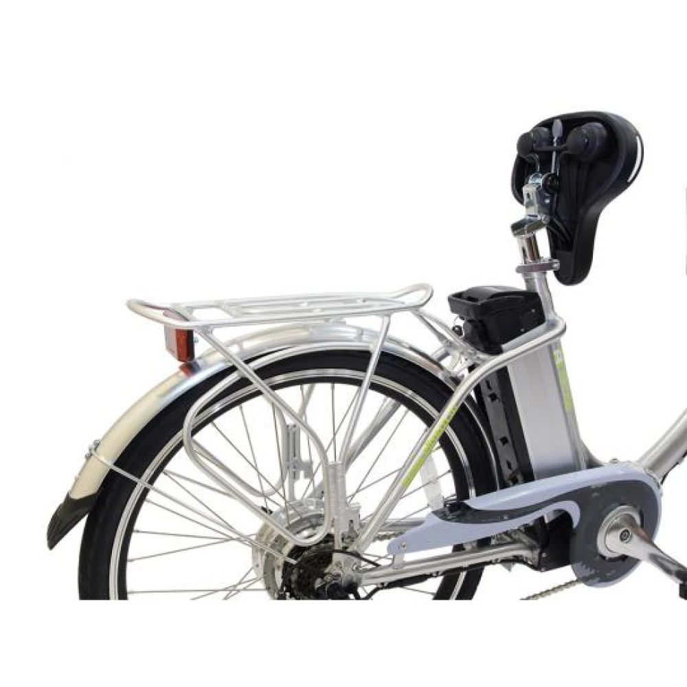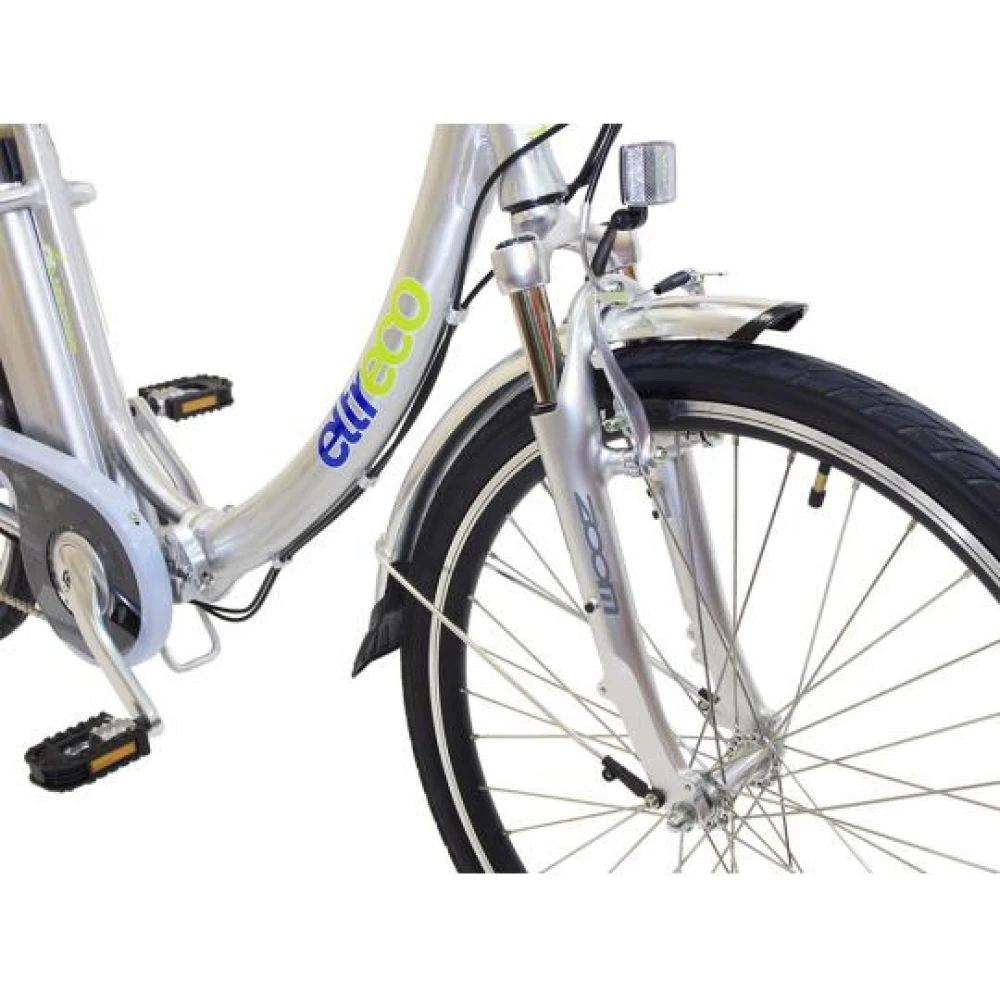 Электрический велосипед Eltreco Vector оснащен литий-ионным аккумулятором, емкость которого составляет 10.4 А*ч, одного заряда хватает на 70 км пути. Зарядить аккумулятор можно подключив зарядное устройство на 6 часов. Есть яркая фара впереди и информационный дисплей, где можно контролировать уровень заряда батареи. Ограничение по нагрузке 130 кг, при собственном весе 26 кг.