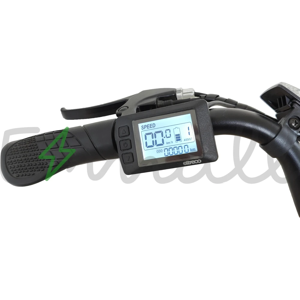Рама изделия усовершенствована. Стала максимально легкой благодаря изящному алюминию. Рулевая часть велогибрида оснащена LCD-велокомпьютером Eltreco M3, благодаря которому удобно отслеживать скоростные характеристики, заряд АКБ и другие параметры.