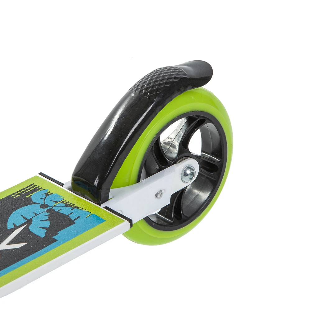 Сзади установлен ножной тормоз, который позволяет быстро остановиться при необходимости. Переднее колесо диаметром 145 мм и заднее колесо диаметром 125 мм обеспечивают отличную маневренность и устойчивость на любых поверхностях. Бело-зеленый дизайн добавляет яркости и стиля, делая каждую поездку увлекательной и безопасной.