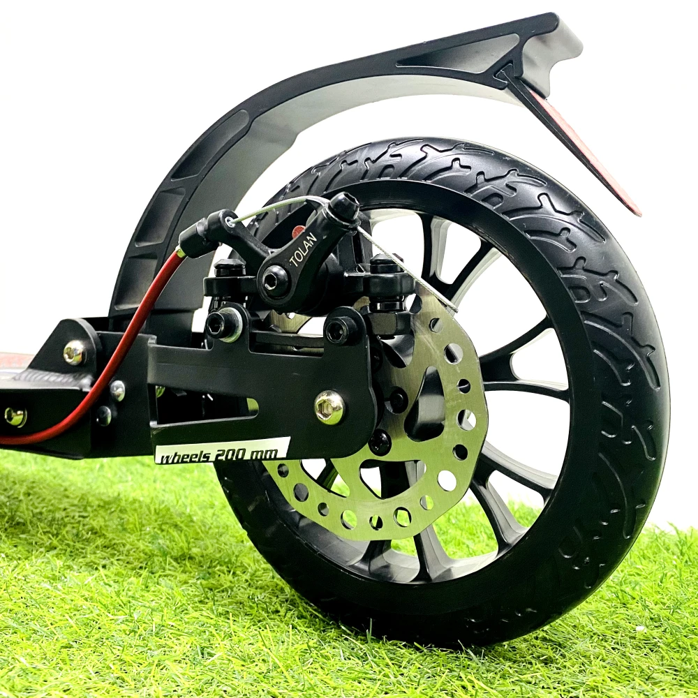 Визуально самокат ничем не отличается от взрослого. Модель оснащена мало стираемыми колесами, передними и задними амортизаторами, делающими движение плавным и беспроблематичным. Характеристики самоката обеспечивают безопасную скоростную езду по городской местности и парковой зоне.