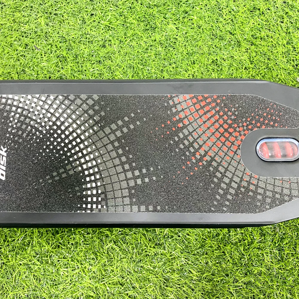 Дека изготовлена из сверхпрочного алюминия, широкая, покрыта нескользящей шкуркой, исключает риск падения ездока. Дисковая тормозная система, защищенная брызговиком со светодиодным оформлением, обеспечивает своевременное торможение.