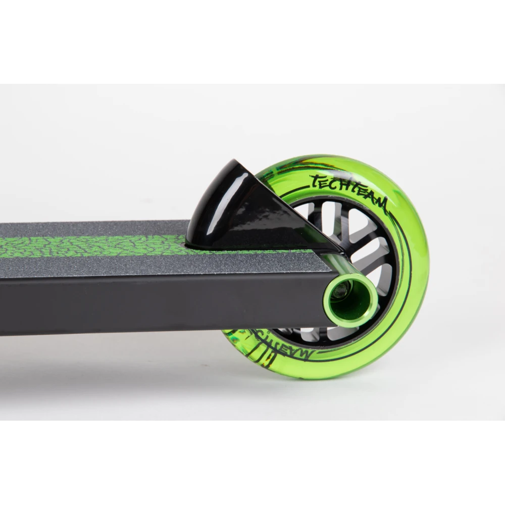 Отличительными деталями самоката является дека, передняя часть которой скошена и заварена. В качестве опоры для ноги и предотвращения случайного торможения служит стальной фендер.