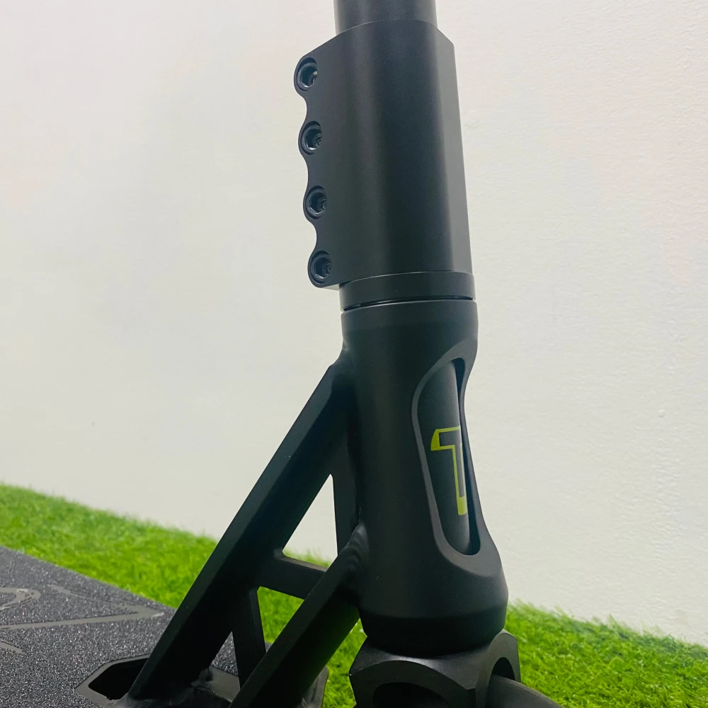 Широкая алюминиевая дека стала намного удобнее для езды за счет своего размера 14*56*41 см. Классическими остались и заваренные скошенная передняя ее сторона и квадратная задняя. Новинкой в этой модели является фендер, который защищает самокат от непреднамеренного торможения. Привычный стальной тормоз тоже не стали убирать. Алюминиевая фрезерованная вилка соединяется с высоким рулем системой SCS-компрессии с четырех болтовым зажимом на болтах-"шестерках”. Вращения колес обеспечивает подшипник ABEC 9 Chrome. А сами колеса выполнены из полиуретана с дисками из алюминия.