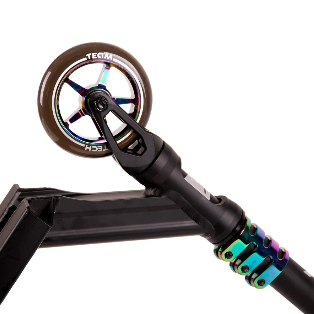 Техника представлена облегченной конструкцией. Весит 3,8 кг. Минималистичная и эргономичная, послушная в управлении. Т-образная часть руля изготовлена из хроммолибденовой стали. Высота руля от зажима и от поверхности составляет 61,5см и 85 см соответственно. Ширина – 54 см и диаметр 34,9 мм удобные для хвата, не провоцируют усталости при длительной эксплуатации техники. Дека размерами 49х12 см изготовлена из высокопрочного алюминиевого сплава, нескользящая, исключает случайные действия в виде соскальзывания стоп. Оснащенность модели конкейвом обеспечивает безопасность, позволяет контролировать собственные действия во время прыжков, выполнения других элементов трюкачества. Накатистые полиуретановые колеса с сердечником 110х24мм оснащены современными подшипниками, обеспечивают максимальный разгон, важный для каждого трюкача. Для заказа трюкового самоката предлагаем связаться с нашим менеджером.